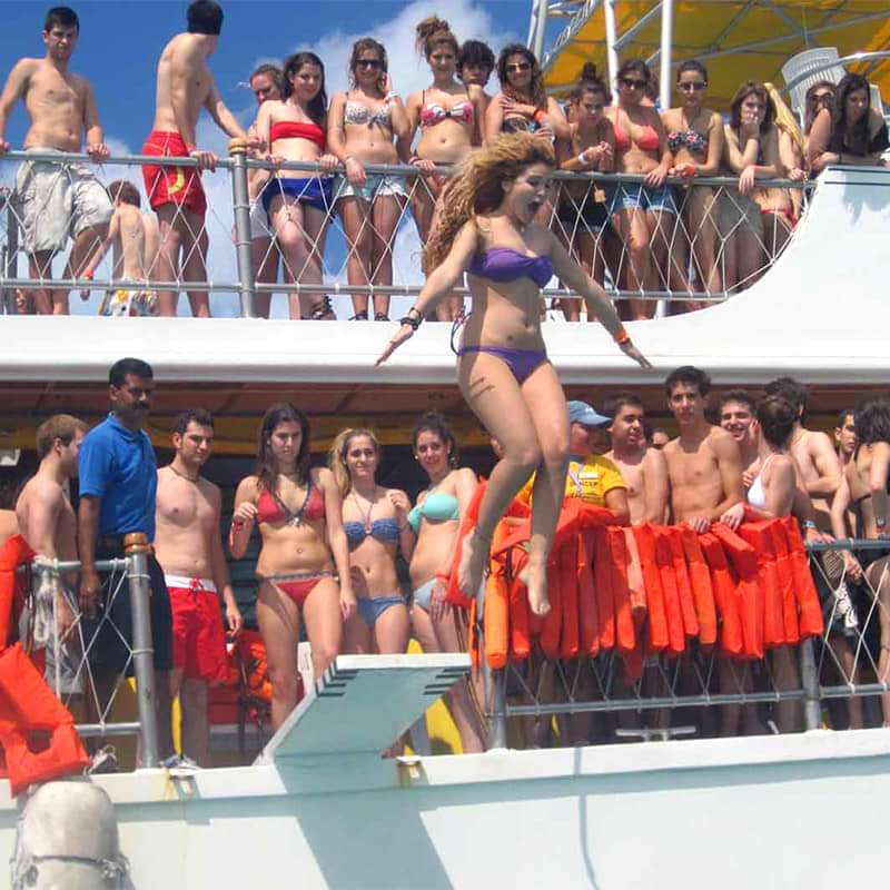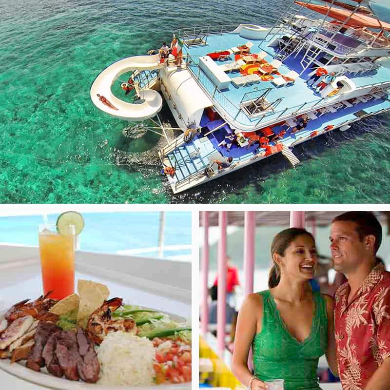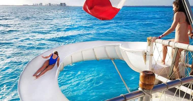 The stunning catamaran is packed with entertainment, including a bar, dance floor, diving board, and pool area. On the 2nd floor you can lounge in deck chairs, enjoy a water-slide, or sit back and watch the flat-screen TV. From the 3rd floor, get panoramic views of Cancun and the Riviera Maya beyond.