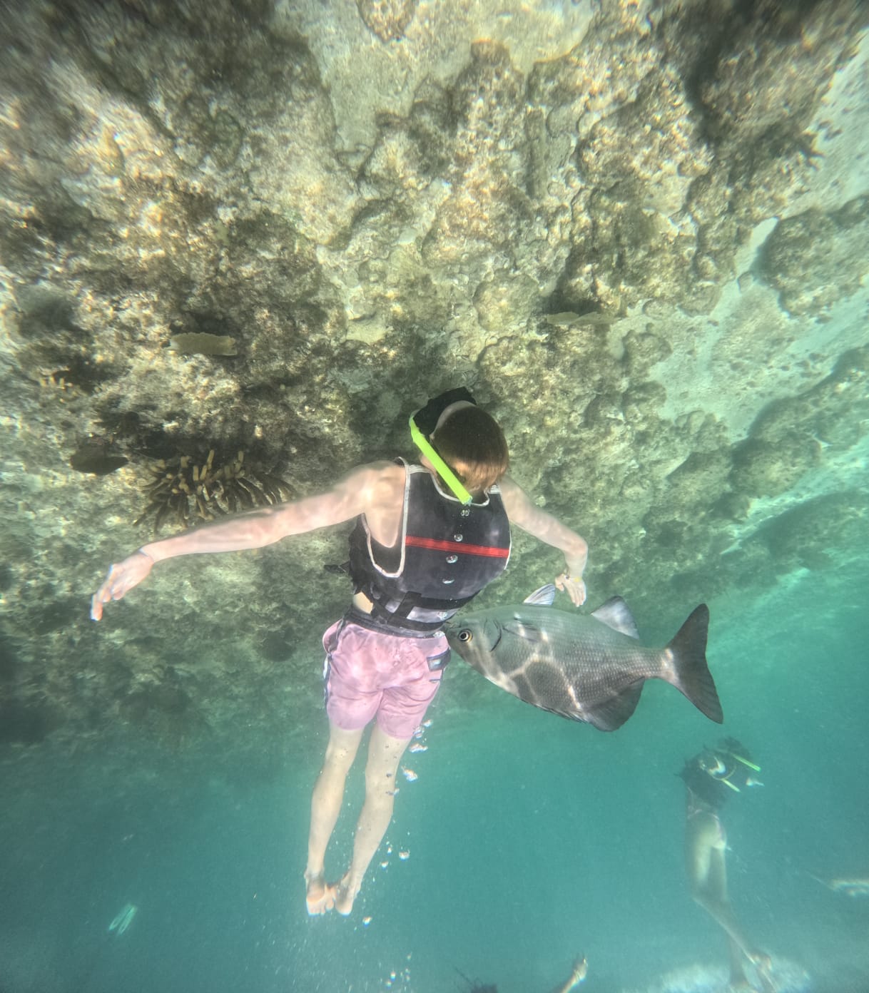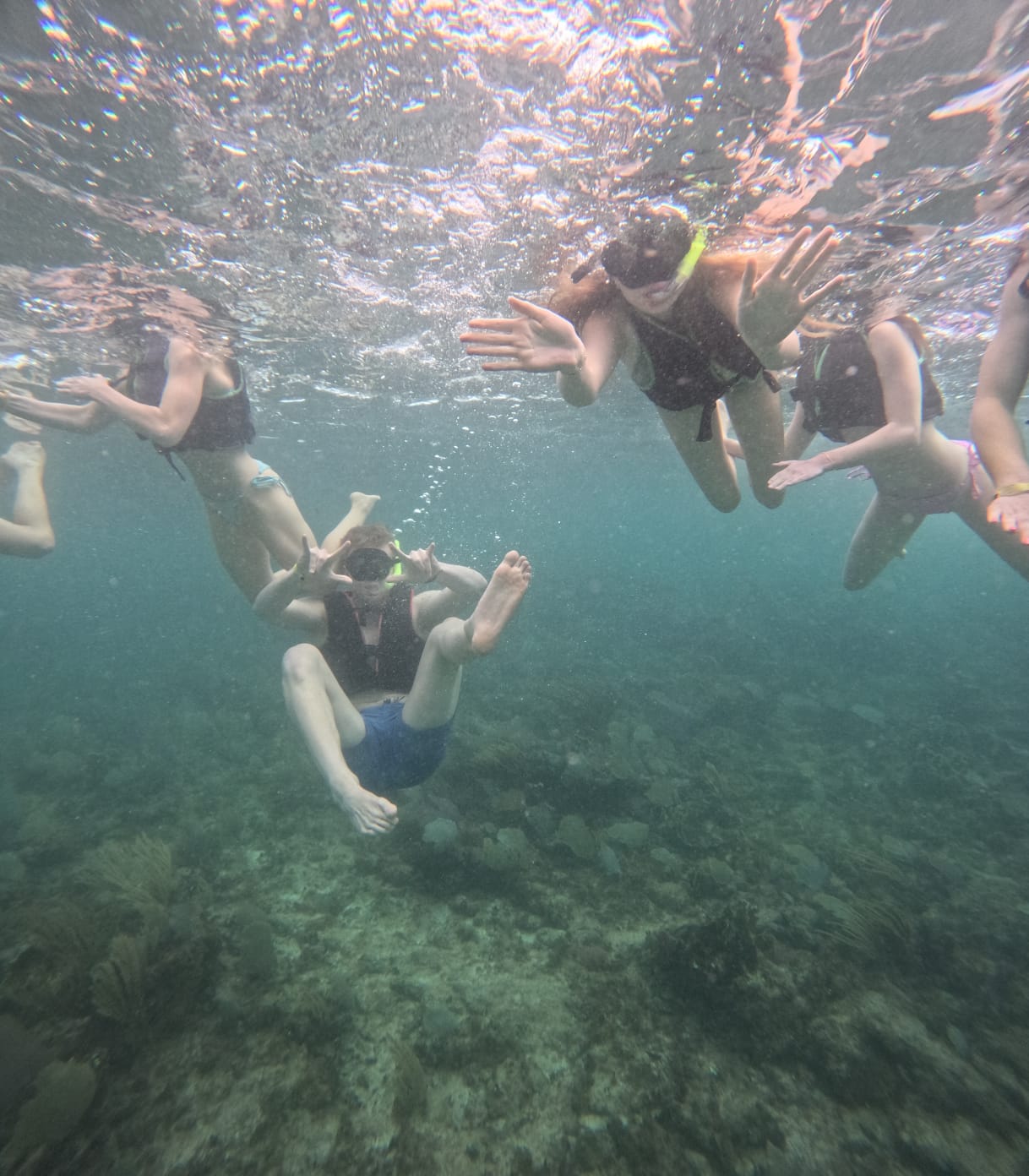 We set sail for approximately one hour, dragging fishing lines as we head to the second largest reef of the world which supports colorful coral heads, a variety of tropical fish and marine life and sea turtles. You can choose to snorkel, stay on board and relax or take a refreshing dip in the ocean, or have a blast on our water slide!